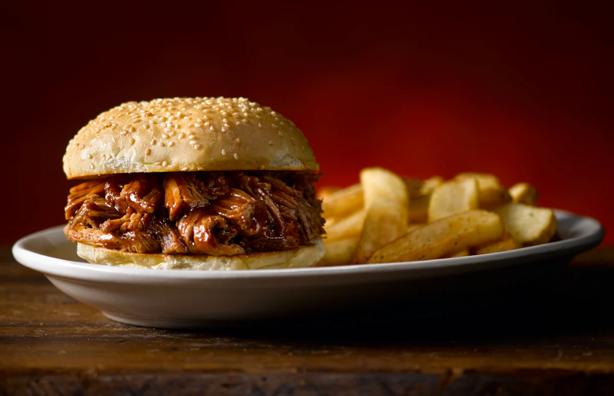 Tender, slow-cooked BBQ pulled pork served on a Texas-sized bun with steak fries and a pickle spear.